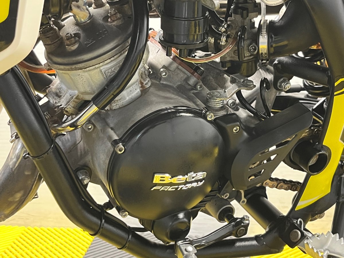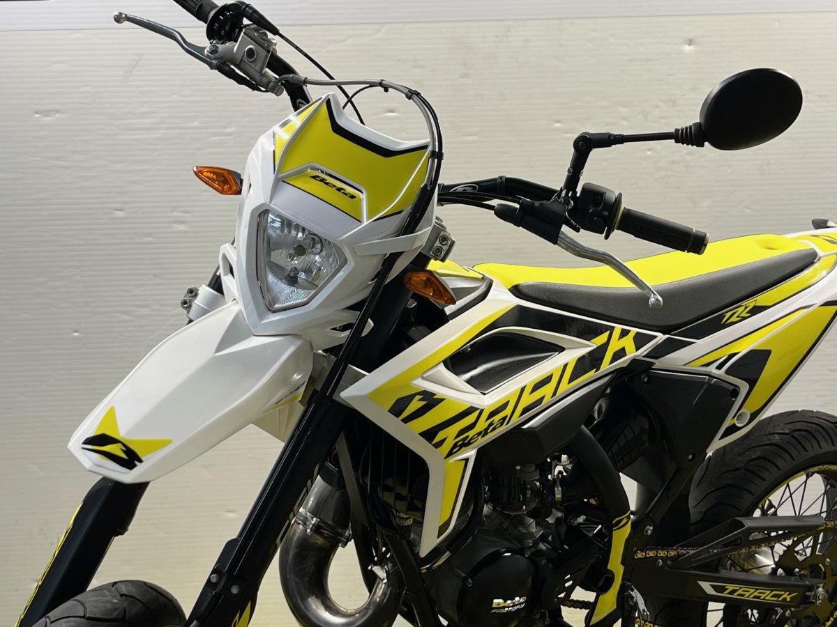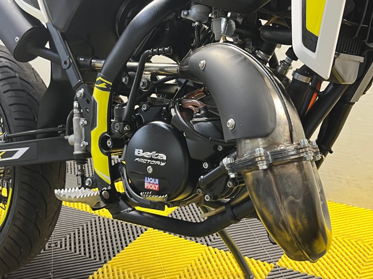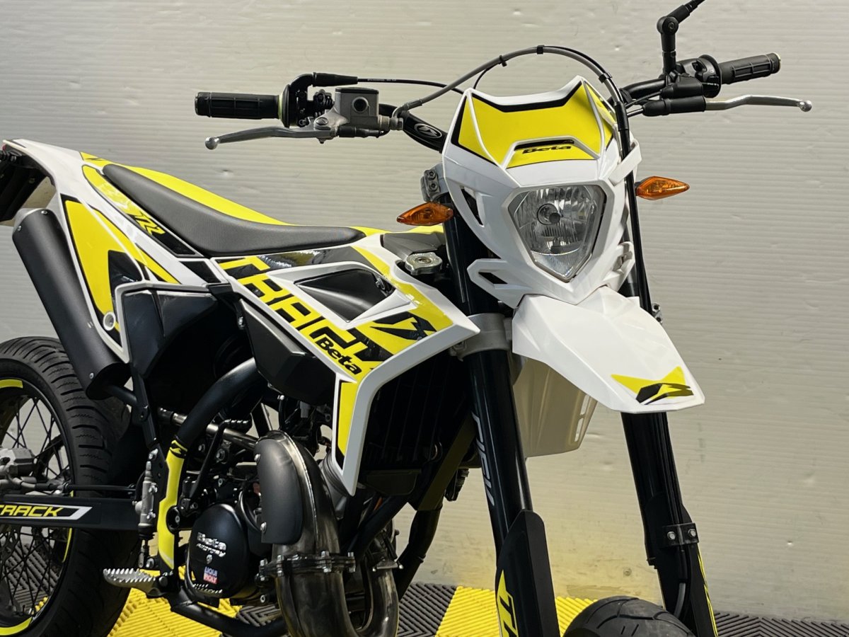 Moteur Minarelli 2 temps à refroidissement liquide et graissage séparé - fourche inversée - échappement finition inox brossé - roues à rayon - guidon sans barre section cônique.